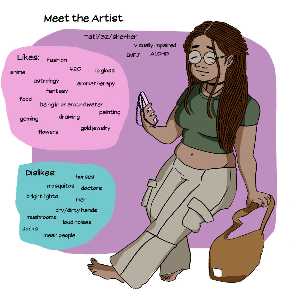 Hi, my name is Tati. I'm 33 years old and live in Michigan. I do Freelance Illustration & Game Development.Nice to meet you!I've been drawing traditionally since I was 3 years old and digitally since around 6 years old. My mother was a photographer so I had access to traditional and digital supplies from a very young age. I won several awards throughout school but decided to pursue other interests in college.I've been doing freelance commissions off and on since 2017 and even opened up my own sticker shop (now on hiatus).In 2025 I gave Solo Game Development a shot and started a fangame project & my own RPG.